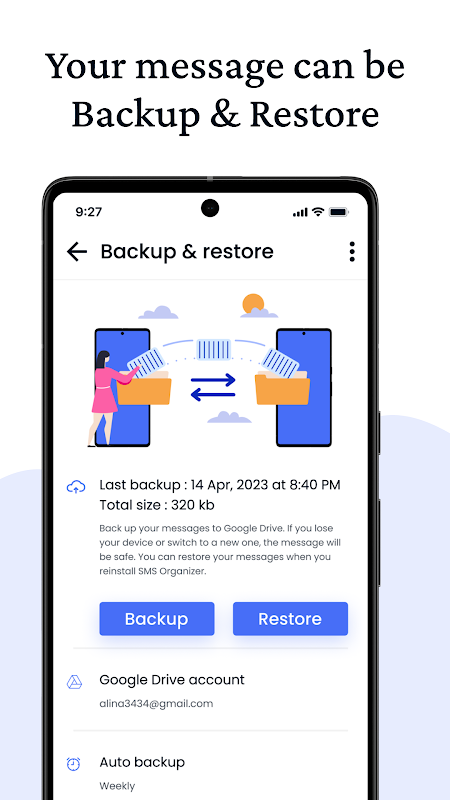 Puoi eseguire il backup di tutti i messaggi di testo sui tuoi dispositivi o inviare il file di backup con un'e-mail. Dopo aver ripristinato i tuoi dispositivi, ripristinare tutte le conversazioni di messaggi da un file di backup è semplice.