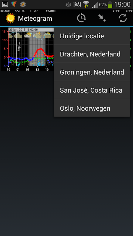 The weather prediction graph can be shown in the main application or in home screen widgets. Multiple widgets for different locations and settings can be shown simultaneously.