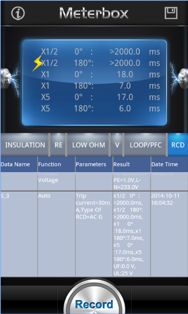 Meterbox iMIT for Android app is the professional industry software, which provides insulation resistance,earth resistance, loop impedance,voltage,RCD,PFG and PSC testing by CEM Multifunction Installation Tester DT-6650 via Bluetooth, for ensuring the safety of electrical installations in domestic,commercial and industrial application, for fixing wiring is safe and correctly installed. Meterbox iMIT app enhances user experience about visualization, measuring scene, data logging, data comparing & data sharing.
