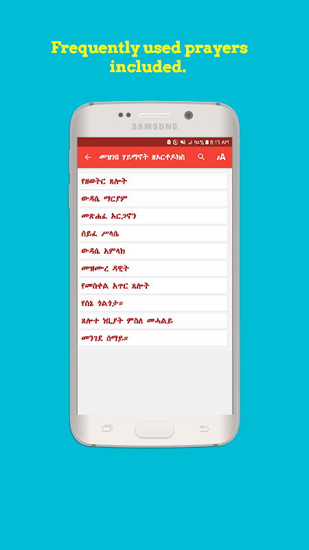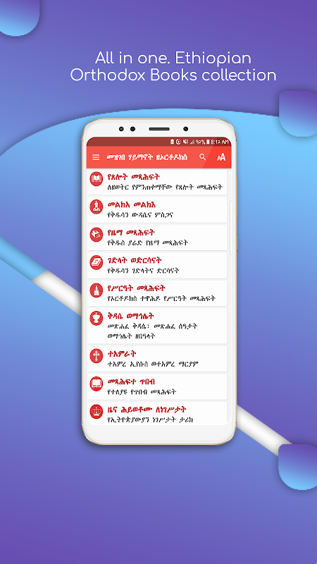 Mezgebe Haymanot è un'applicazione mobile con una vasta collezione di libri della Chiesa ortodossa etiope di Tewahedo. L'applicazione contiene più di 200 libri ortodossi con più categorie. L'applicazione contiene più libri di preghiera, riti, salmodori, inni, melodie, servizi, sacramenti della Chiesa ortodossa etiope. Libri inni di santo Yared, libri liturgici, libri di Aba Giyorgis Zegasicha, preghiere di santi e angeli, commenti biblici, libri canonici,