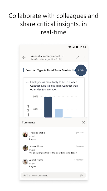 Accesso ai dati da qualsiasi località grazie all'app Power BI. È possibile ricevere notifiche, aggiungere annotazioni e condividere, analizzare approfonditamente i dati usando potenti funzionalità che agevolano il processo decisionale anche quando non si è in ufficio.