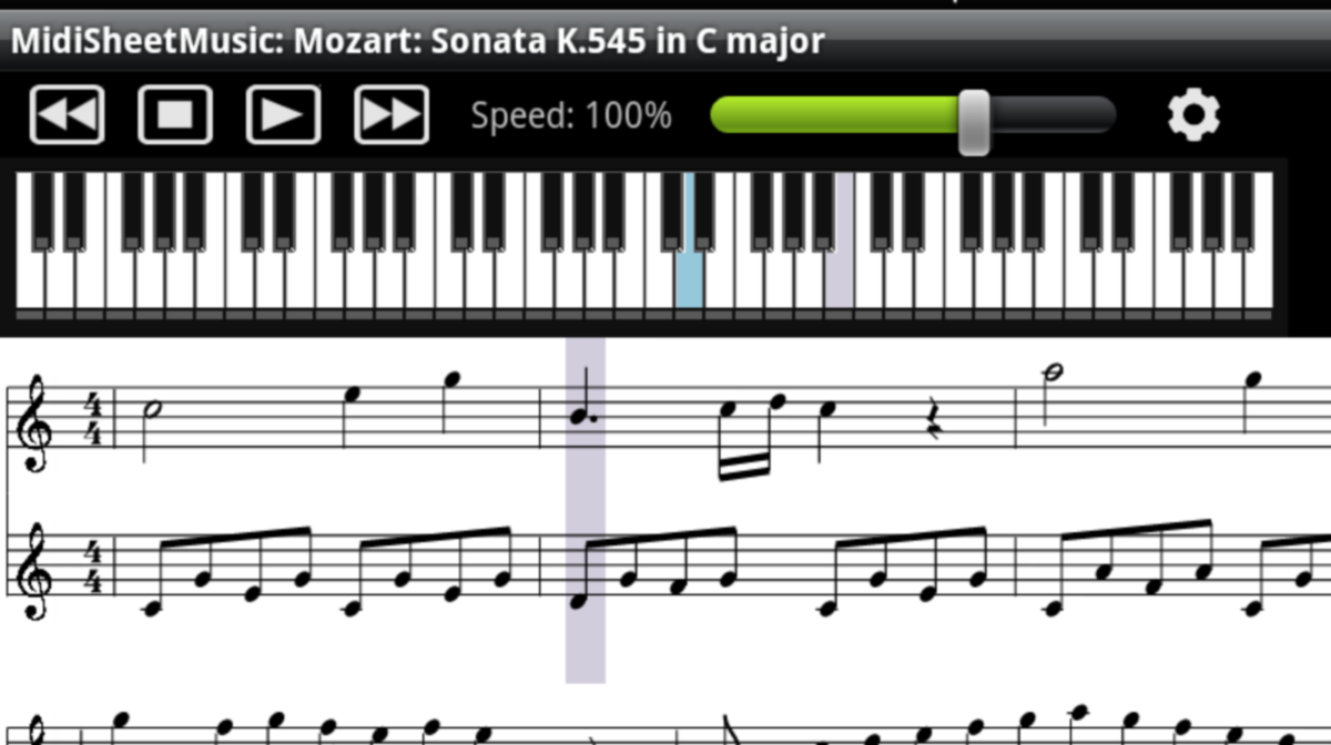 Midi Sheet Music è un'applicazione Android gratuita per la conversione di file musicali MIDI in spartiti. Essa svolge simultaneamente i file musicali MIDI, mette in evidenza le note del pianoforte, ed evidenzia le note musicali foglio.