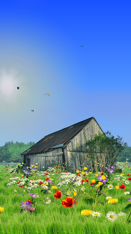 Scena di mezza estate live wallpaper dinamico con le nubi in movimento e fiori ondeggianti.