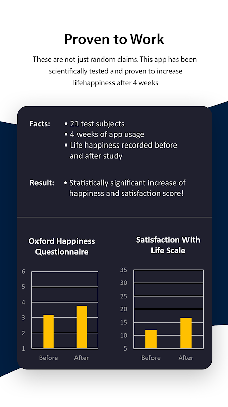 Dichiarazione di non responsabilità sulla sicurezza: questa applicazione ha il solo scopo di supportare l'utente nel suo miglioramento, ma deve portare con sé una motivazione intrinseca affinché funzioni. Non è affermato che l'app possa farlo attraverso il semplice utilizzo. Lo sviluppatore non è un medico professionista o uno psichiatra; se soffri di problemi seri o di depressione, visita un professionista.