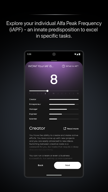 1. Il BCI Mind Tracker determina la frequenza Alpha Peak individuale (iAPF) dell'utente. L’IAPF è una caratteristica intrinseca geneticamente determinata dell’attività cerebrale che è responsabile del modello comportamentale di una persona