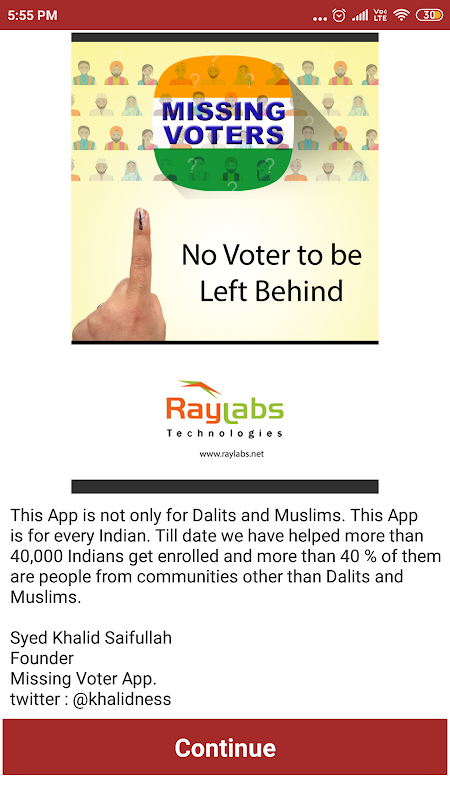 RayLabs aveva identificato 18 lakhs. Gli elettori musulmani mancavano nello stato di Karnataka e lanciavano l'app mobile. Quando questo è stato pubblicato su giornali, 8000 volontari si sono iscritti all'App, hanno visitato le famiglie di elettori scomparsi presenti in app e hanno aiutato centinaia di migliaia di persone a iscriversi.