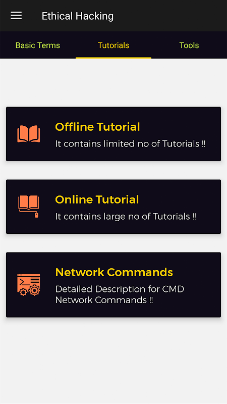 This App provides a huge collection of Ethical Hacking Tools, Tutorials and Computer Shortcut Command Keys and Network Utilities...