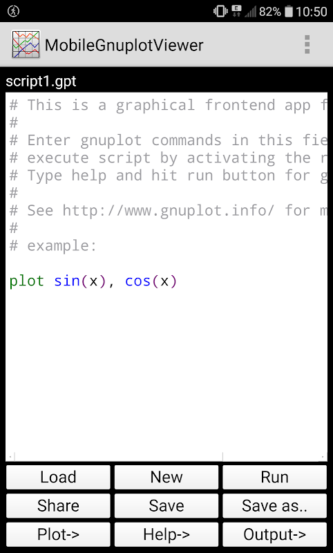 Gnuplot utilizza una finestra della shell per immettere comandi di testo interattivamente e una finestra di output per mostrare simultaneamente l'output grafico. Su un dispositivo mobile come uno smartphone o un tablet questo flusso di lavoro non è adatto, poiché l'utente ha solo uno schermo piccolo, è difficile avere più di un'area di input / output sullo schermo. Per utilizzare l'eccellente programma gnuplot su un dispositivo mobile ho scritto questa app.