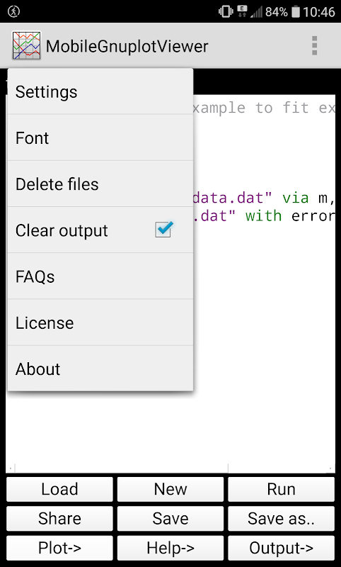 Gli script di Gnuplot possono essere creati con questa app e l'output SVG verrà mostrato come un grafico nell'app (vedi screenshot).