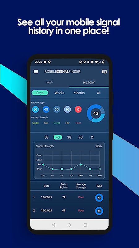 Visualizza i dati storici sulla potenza del segnale di rete per le tue reti 2G, 3G, 4G e 5G. Ottieni una comprensione più ampia della cronologia del tuo segnale mobile visualizzando le tendenze delle prestazioni per giorno, settimana, mese e sempre.