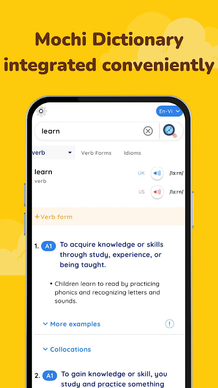 Dizionario Mochi (scheda Dizionario): Mochi Listening integra una funzionalità di dizionario integrata. Puoi cercare rapidamente il vocabolario con informazioni complete: tipo di parole, fonetica, audio, significati, esempi,...