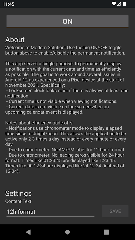 Questa app ha un unico scopo: visualizzare una notifica con la data e l'ora correnti nel modo più efficiente possibile. L'obiettivo è risolvere diversi problemi in Android 12 riscontrati su un dispositivo Pixel all'inizio di novembre 2021: