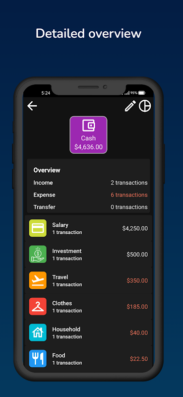 Con questa applicazione, si sarà in grado di controllare le entrate e le spese. È possibile visualizzare le statistiche per un tempo specifico per una categoria specifica.
