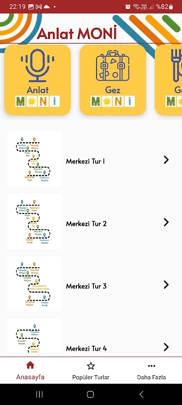 Nell'applicazione mobile, AnlatMoni, GezMoni, GastroMoni, KalMoni, LegendMoni, Rehber Sensin e Li conosci? Ci sono aree.