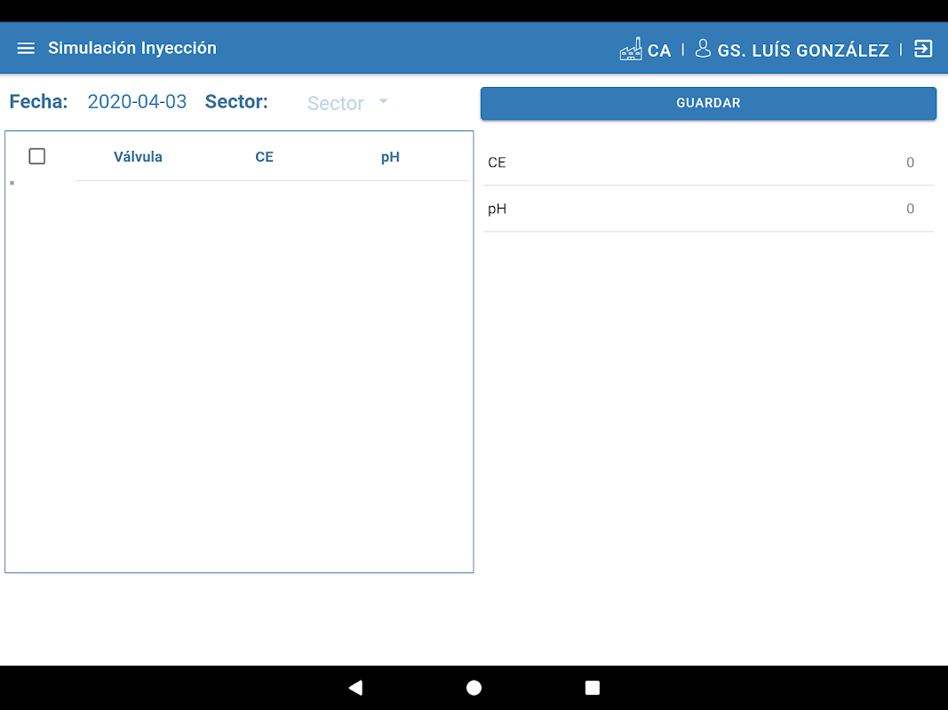 APP SEM. Cuenta con funcionalidades inicialmente de sincronización de información proveniente de planos de siembra, después de realizar el inicio de sesión correspondiente para ingresar a la aplicación, se va a visualizar la información referente a los bloques existentes según la finca, por cada bloque se encuentran las válvulas pertenecientes al bloque. Y de acuerdo con la selección de la válvula, se puede visualizar tipo de flor, tipo de cama y se podrá ingresar la fecha del monitoreo.