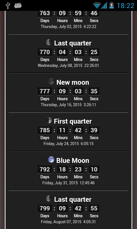 Conto alla rovescia per l'ora esatta delle fasi lunari successive: luna piena, luna nuova e primo e ultimo quarto, nonché le successive lune blu e super lune