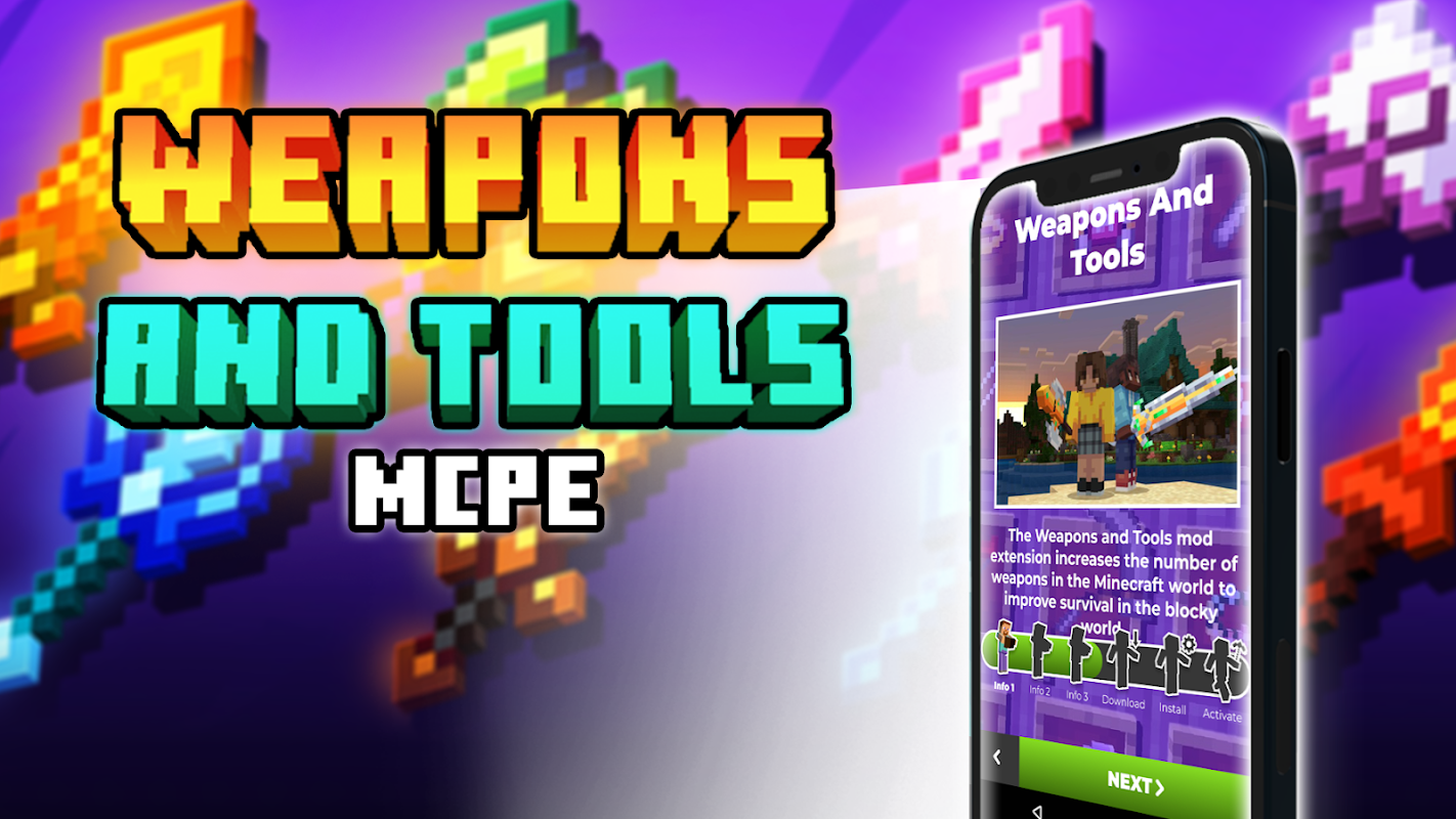Migliora la tua esperienza con Minecraft Pocket Edition con le mod e i componenti aggiuntivi che desideri. Con Armi per Minecraft PE puoi aggiungere più di 300 tipi di nuove armi: spade, mazze, lame, coltelli a catena, chokuto, fionde e molte altre nel tuo mondo Minecraft pocket edition e migliorare tutti i blocchi.