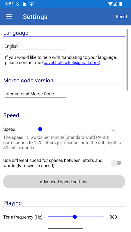 È possibile regolare la velocità di trasmissione, la velocità di Farnsworth, la frequenza del tono e altre impostazioni. È anche possibile scegliere una delle versioni del codice Morse. Attualmente, sono supportati il codice Morse internazionale e alcune versioni locali (ad esempio, greco, giapponese, coreano, polacco, tedesco e altre).