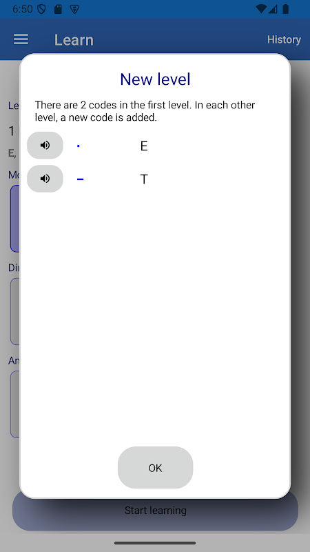 • La scelta del livello è completamente a discrezione dell'utente. Non è necessario iniziare dall'inizio se si conoscono già le basi. Anche il passaggio al livello successivo è a discrezione dell'utente. Quando ci si sente sicuri di poter tradurre facilmente tutte le lettere del livello corrente, basta toccare il pulsante per passare al livello successivo.