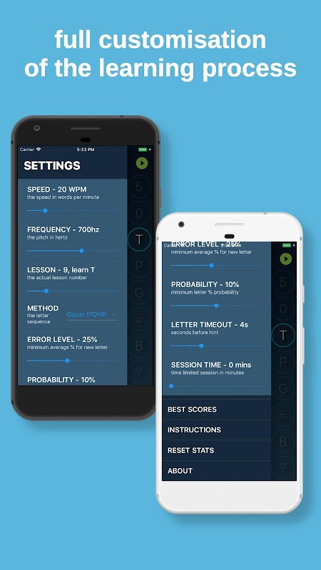 Di default l'app usa la sequenza di lettere del metodo 'Koch' e inizia con le prime due lettere: K e M. Ma puoi usare uno qualsiasi dei metodi disponibili e trovare quello più adatto alle tue preferenze. C'è anche un programma di allenamento per le prime 40 parole usate durante un QSO in CW.