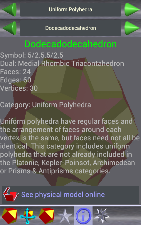 Prendere poliedri con te ovunque tu vada! Ruotarli in 3D, esplodere i loro volti a parte, vedere i loro duali e trasformarsi poliedri in loro duali in un paio di modi diversi. Visualizza informazioni quali il viso, bordo e conta di vertice, e se disponibile, un collegamento alle fotografie online dei modelli di carta realizzati da Robert Webb. Un must per gli appassionati di poliedri o geometria sacra.