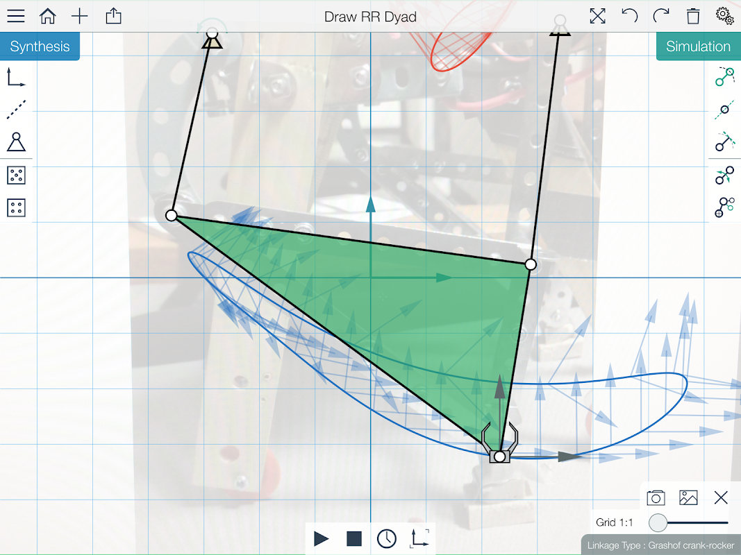 MotionGen è un'app per iOS e Android per la sintesi e la simulazione di collegamenti planari a quattro barre.