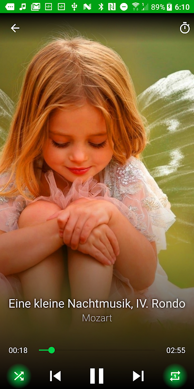 The app has timer, you can set it and go to sleep, the music will be stopped automatically. The app has shuffle mode to play music in random order and repeat mode to play the same song again automatically.