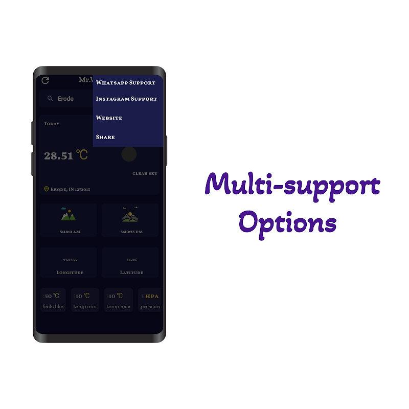 L'app Mr.weather fornisce anche pressione atmosferica, condizioni meteorologiche, distanza di visibilità, umidità relativa, precipitazioni in diverse unità, punto di rugiada, velocità e direzione del vento, oltre a dieci giorni futuri e previsioni meteorologiche orarie.