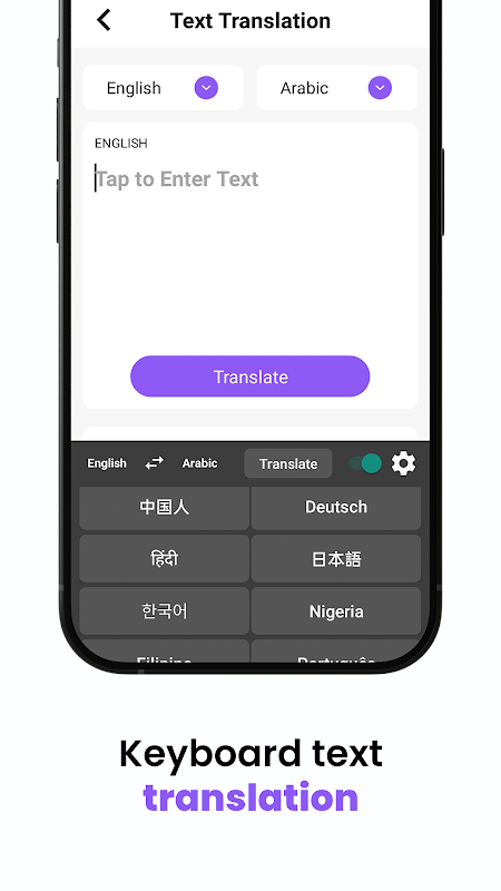 - Apri qualsiasi app di chat o messaggistica, cambia lingua con un tocco e utilizza il pulsante di traduzione per traduzioni in tempo reale!