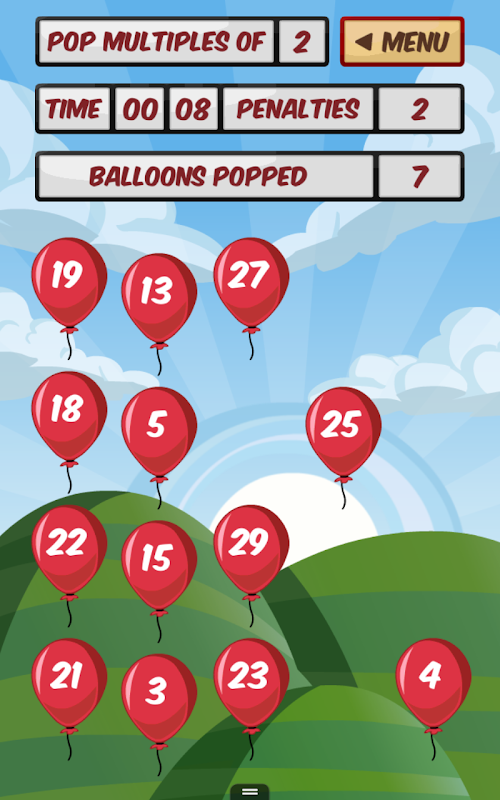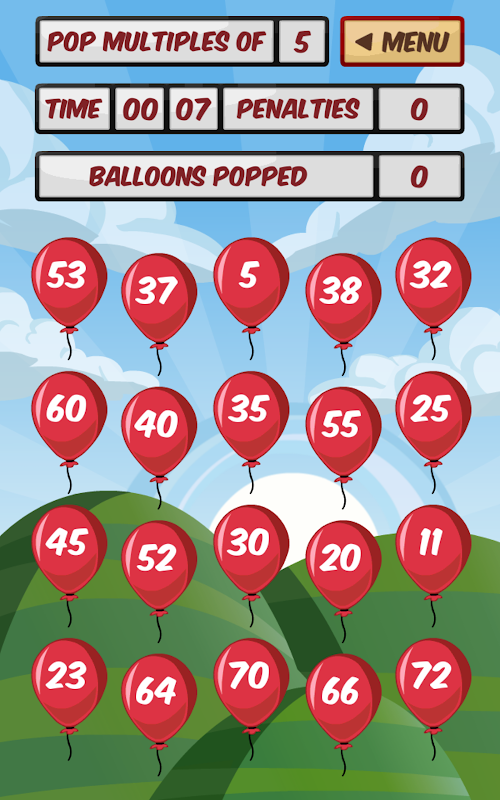 Choose the multiplication fact you need to practise from the front screen, and then pop all the balloons containing a multiple of that fact as fast as you can! Be careful though, clicking on an incorrect multiple will cost you a time penalty. Total time taken plus any penalties will be displayed after each game with the quickest round for each fact being set as a ‘Best Time’.
