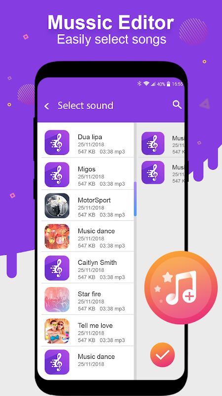 ★ Selezione facile di brani dal browser delle cartelle. Un browser di cartelle è stato creato per selezionare brani dalla memoria del telefono, elencherà tutte le cartelle che contengono file audio e file audio da usare.