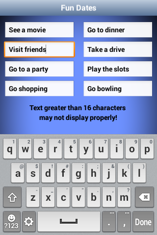 You will have lots of fun configuring the wheel to use with friends, on dates, at parties, in meetings, at school, at work, or just about any situation. Create categories that are educational, fun, naughty, nice, or whatever fits your mood.