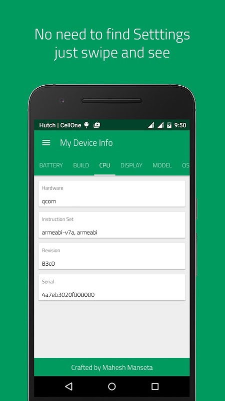 Non è necessario controllare le impostazioni e trovarle una per una in un modulo diverso del tuo smartphone, piuttosto scarica questa app e controlla tutte le Informazioni sul dispositivo in un unico posto, basta scorrere e controllare, nessuna navigazione noiosa.