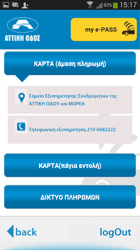 Τώρα από το κινητό τηλέφωνο ή το τάμπλετ σας μπορείτε να βλέπετε με τον πιο εύκολο τρόπο το υπόλοιπο του e-PASS κάθε στιγμή και από όπου κι αν βρίσκεστε. Με την ίδια εφαρμογή μπορείτε να μάθετε πού και πώς θα ανανεώσετε το e-PASS σας στην Αττική Οδό αλλά και στο δίκτυο συνεργατών μας. Επίσης μπορείτε, να συνδέεστε με την Τηλεφωνική Εξυπηρέτηση Πελατών της Αττικής Οδού για την ανανέωση του συνδρομητικού σας λογαριασμού μέσω τραπεζικής κάρτας καθώς και να αποστείλετε ηλεκτρονικό μήνυμα για παροχή πληροφοριών σχετικών με το λογαριασμό σας.