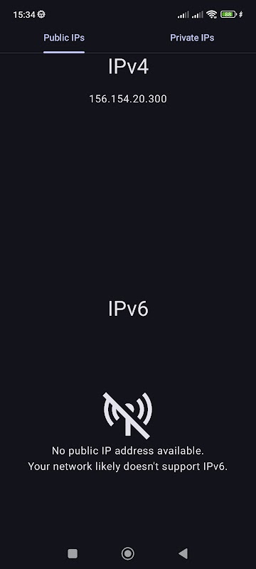 L'app mostra i tuoi indirizzi IP pubblici e privati (IPv4 + IPv6).