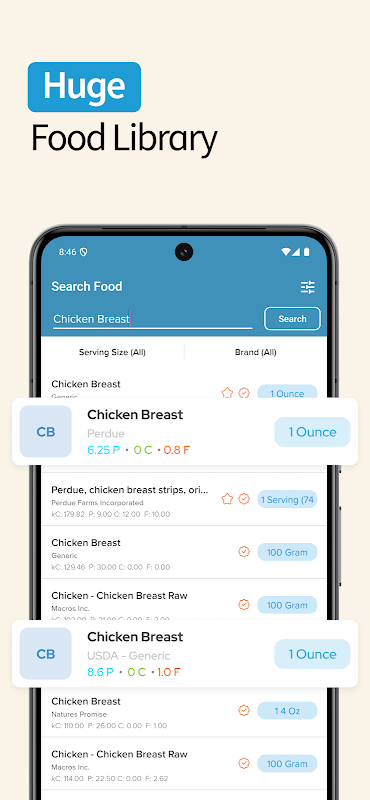 • Tutti gli alimenti sono completamente personalizzabili: inserisci il tuo cibo in qualsiasi dimensione di servizio o modifica un alimento preesistente in base alle dimensioni della porzione che desideri.