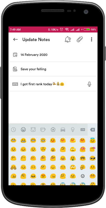 My Notebook è un'applicazione indispensabile per studenti, uomini d'affari e per chiunque utilizzi i propri telefoni e tablet Android per prendere appunti. Il suo diario di stato in tempo reale con serratura. Il suo taccuino surreale. Usa questa app di diario per creare il tuo diario personale di eventi quotidiani, appuntamenti, per inserire i dettagli delle aliquote fiscali GST, i dettagli della tua amicizia, lo stato 4 citazioni, segreti e sentimenti.