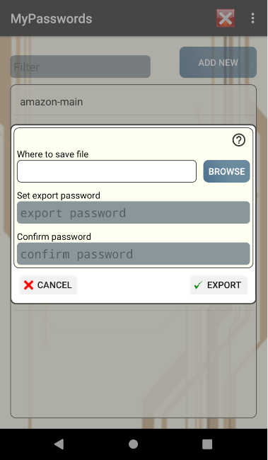 Puoi esportare tutte le tue password in file crittografati e importare da quel file su un altro dispositivo su cui è installato MyPasswords, oppure puoi utilizzare questo file come backup.