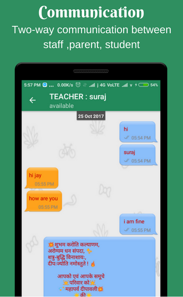 Comunicazione: il personale insegnante dei genitori comunica tramite messaggistica istantanea tramite l'app per dispositivi mobili, ognuno ottiene un accesso separato e visualizza le informazioni secondo l'autorizzazione della scuola. Invia un messaggio a una persona o all'intero gruppo in modo semplice ed efficiente.