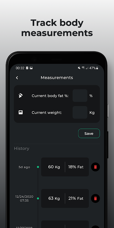 ● Misurazioni del corpo: aggiungi le metriche del tuo corpo nel tempo e scopri come guadagni massa o perdi peso