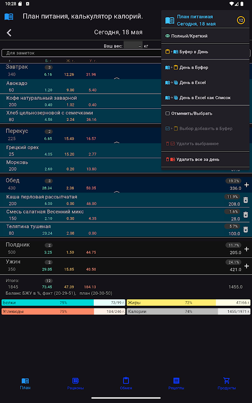 Pianifica i tuoi pasti in base alle calorie e al BJU, condividi i tuoi pasti in Excel.