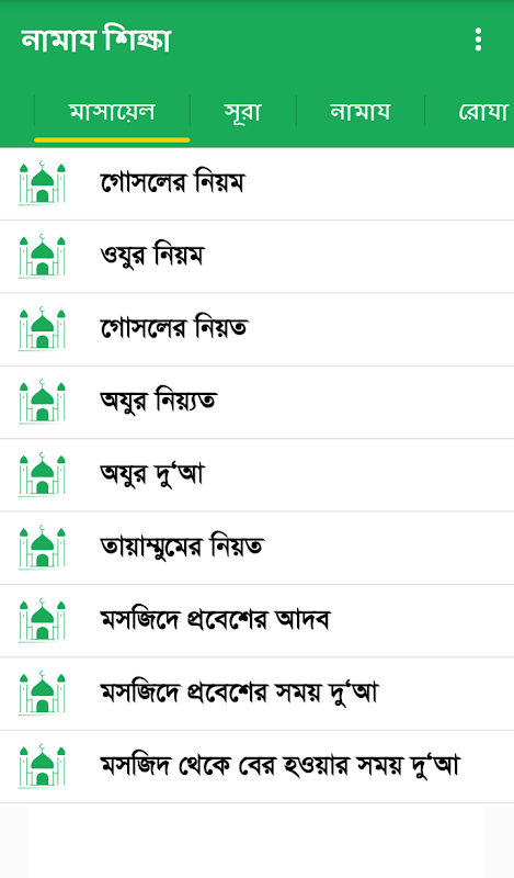 নামাজ শিক্ষা অ্যাপ্লিকেশনটিতে যা যা আছে তা নিচে দেওয়া হলো-
