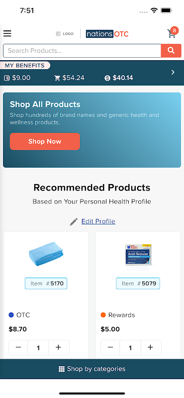L'app mobile NationsOTC offre un'esperienza di coinvolgimento dei membri unica progettata per migliorare i risultati di salute, ridurre la spesa sanitaria e aumentare la soddisfazione. Scarica l'app per sfruttare ancora più facilmente la gestione del tuo vantaggio. Visualizza le informazioni sui vantaggi, crea un profilo sanitario personale e ricevi consigli sui prodotti in base alle tue esigenze individuali. Attraverso l'app mobile NationsOTC, puoi filtrare, ordinare e cercare per categoria, prezzo, portafoglio e altro. Dai un'occhiata più da vicino ai prodotti con immagini a 360 gradi espandibili. Puoi accedere facilmente al monitoraggio dei vantaggi per vedere i dollari disponibili da spendere in prodotti approvati dal piano per vivere uno stile di vita più sano. Tutti gli ordini vengono spediti con consegna in 2 giorni a livello nazionale senza costi aggiuntivi.