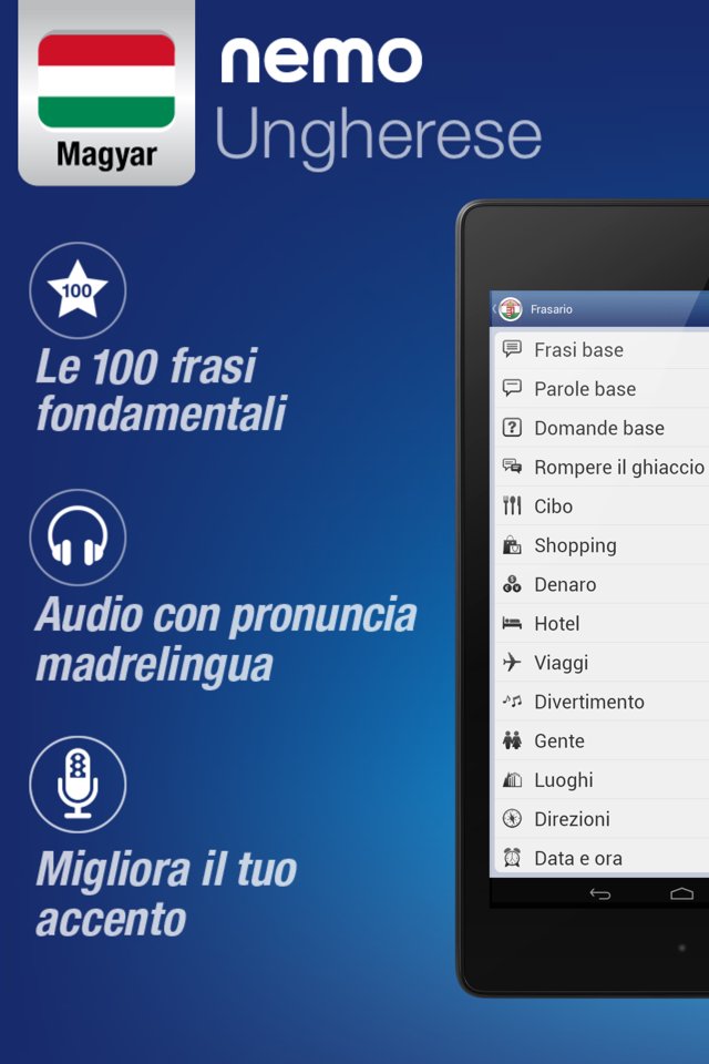 Nemo è pensata per farti cominciare immediatamente e con grande sicurezza a pronunciare le prime parole di ungherese. Con milioni di download da tutto il mondo, Nemo è finalmente disponibile anche su telefoni e tablet Android.