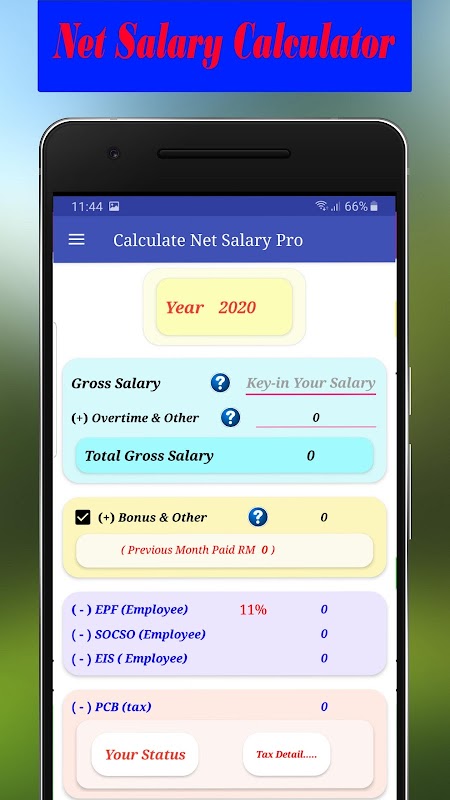 Calcola il reddito salariale netto mensile dopo la detrazione legale in base al paese della Malesia. Detrazioni legali che sono EPF, SOCSO e PCB (imposta) basate su norme e regolamenti locali. Aggiunto anche il calcolatore EIS che costituisce un requisito delle leggi e dei regolamenti locali.