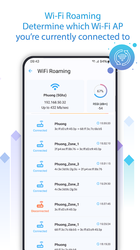 - L'applicazione aggiorna costantemente la forza del segnale in modo da poter camminare intorno alla casa, al lavoro o ovunque si collega a WiFi per trovare la migliore connessione.