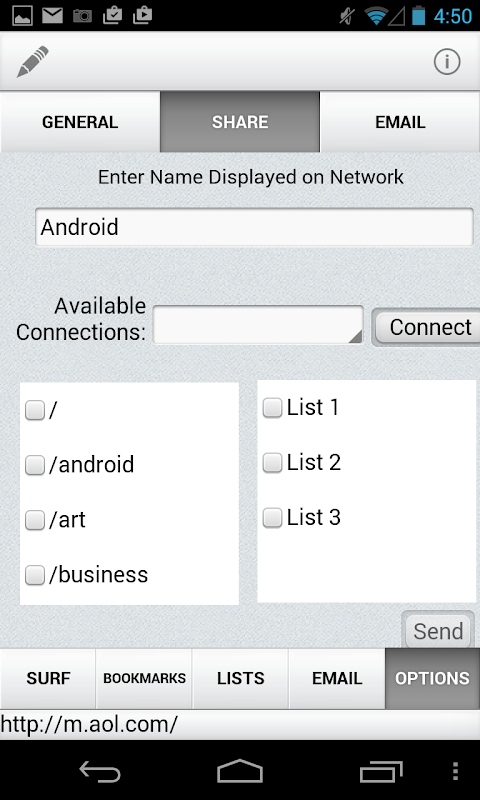 Browse the Web using one or more tabs per web site page. Favorite Web Sites can be added or deleted, multiple lists of favorite web sites can be made that can be run as a slide show. You can send and receive E-Mail with Net Viewer Lite with any of your EMail Accounts. You are provided with a Web Page that will give you Pop3, SMTP addresses, and Port Numbers used for many email services Lists of Web Pages, for example, Stock Quotes, can be set to be refreshed automatically on a timer. You can convert your Favorites from Windows to BookMarks (used by Net Viewer Lite) that can be exchanged over your Local Area Network or WiFi between all devices running Net Viewer Lite. You can send a single Web Page to anyone on your Network using Net Viewer Lite.