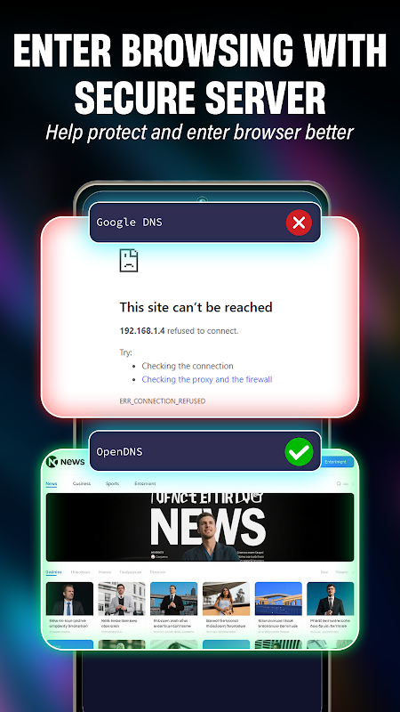 •Cambia DNS veloce e sicuro: passa con un solo tocco da un provider DNS pubblico affidabile all'altro.