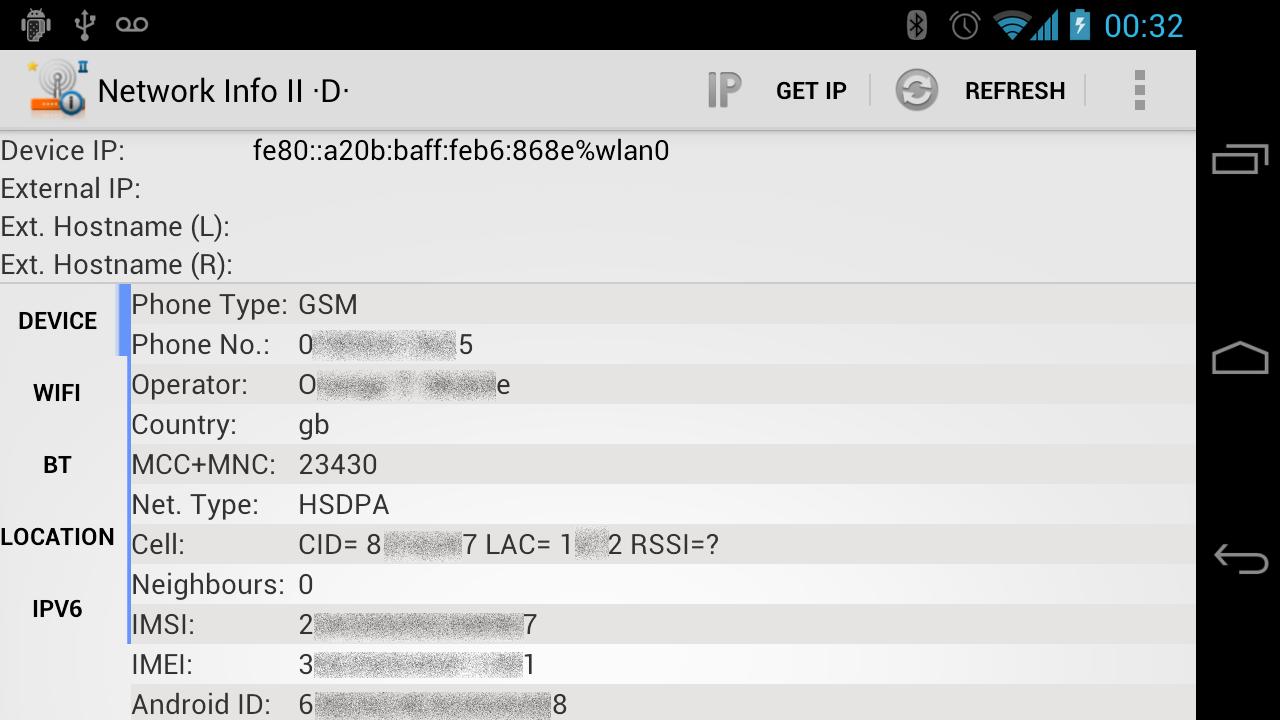 • informazioni circa l'attuale gestore di telefonia mobile (MCC + MNC, connessione corrente, etc.)