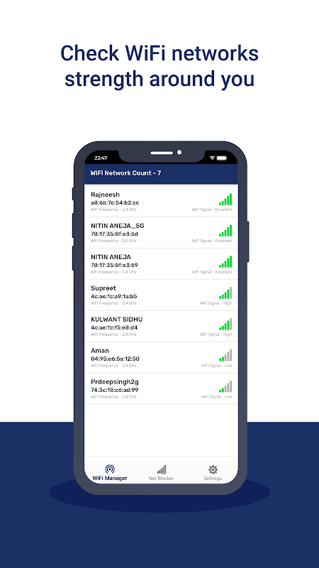Trova un elenco di tutte le reti Wi-Fi e gli hotspot nelle vicinanze. Mostra anche i dettagli di sicurezza, la frequenza e la potenza del segnale di tutte le reti Wi-Fi vicine.